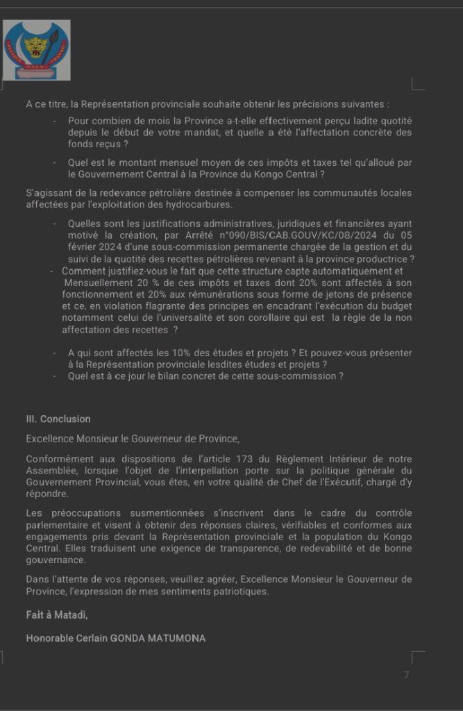 Dans un document de 6 pages, l’élu surnommé » Léopard de Madimba » précise que son initiative repose sur les articles 170 et 173 alinéa 3 du Règlement intérieur de l’Assemblée provinciale, qui confèrent aux députés le droit de contrôler l’action du gouvernement provincial et d’exiger des explications sur sa gestion.