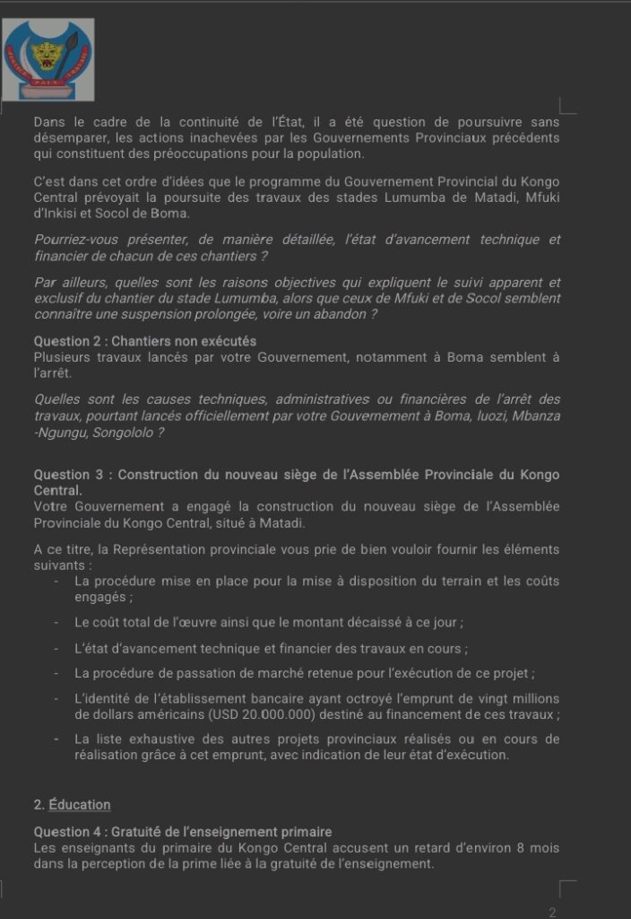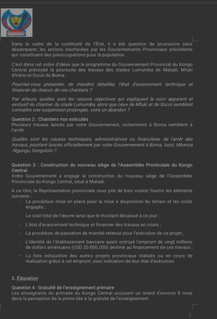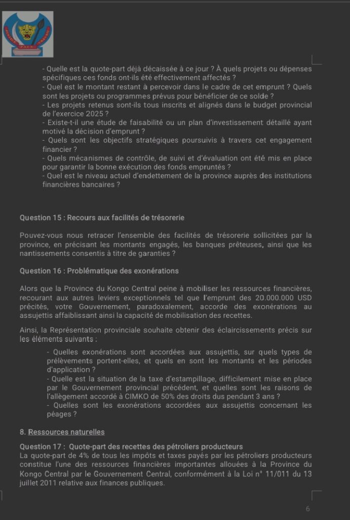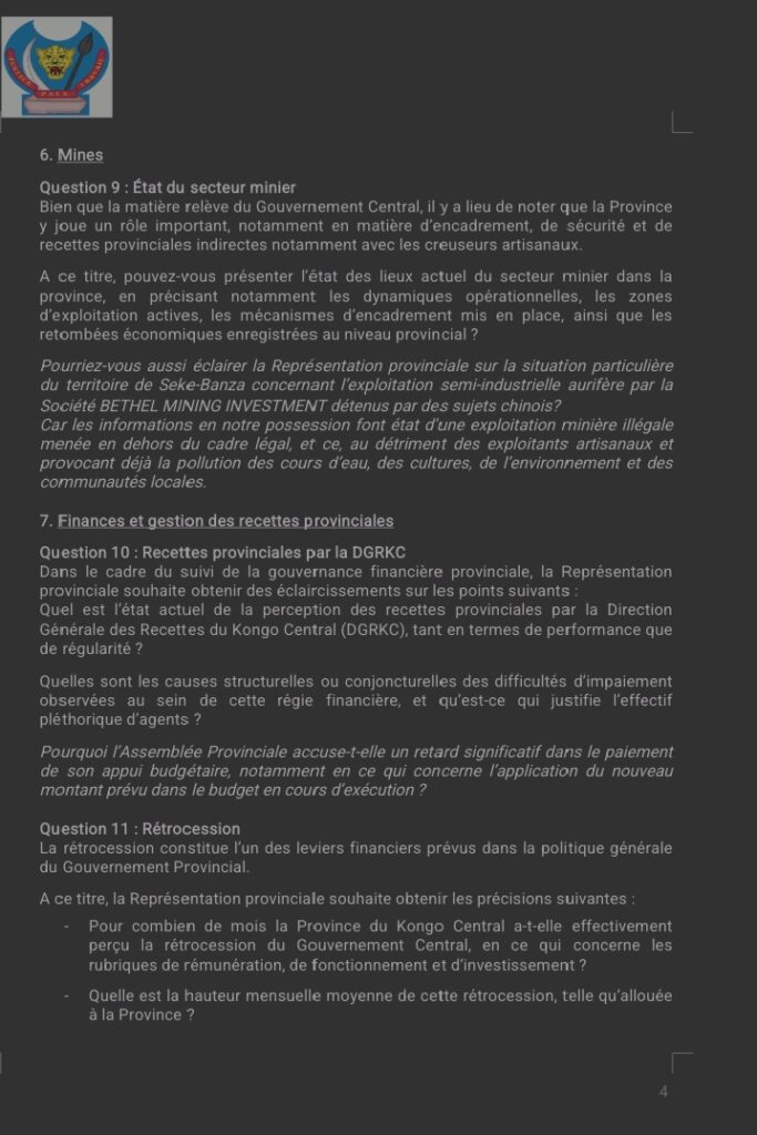« Ces préoccupations visent à obtenir des réponses claires, vérifiables et conformes aux engagements pris devant la Représentation provinciale et la population du Kongo Central », écrit-il.
