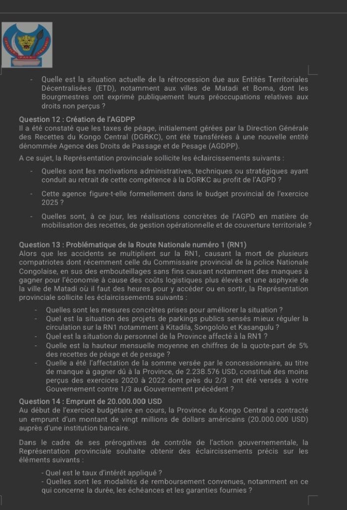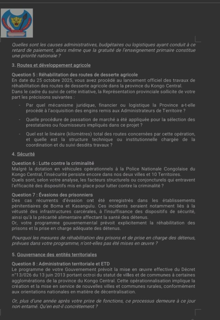Le document, intitulé « Interpellation sur la politique générale du Gouvernement provincial adressée à Son Excellence Monsieur le Gouverneur de la Province du Kongo Central », comporte 17 grandes préoccupations articulées autour des principaux axes de la gouvernance provinciale.