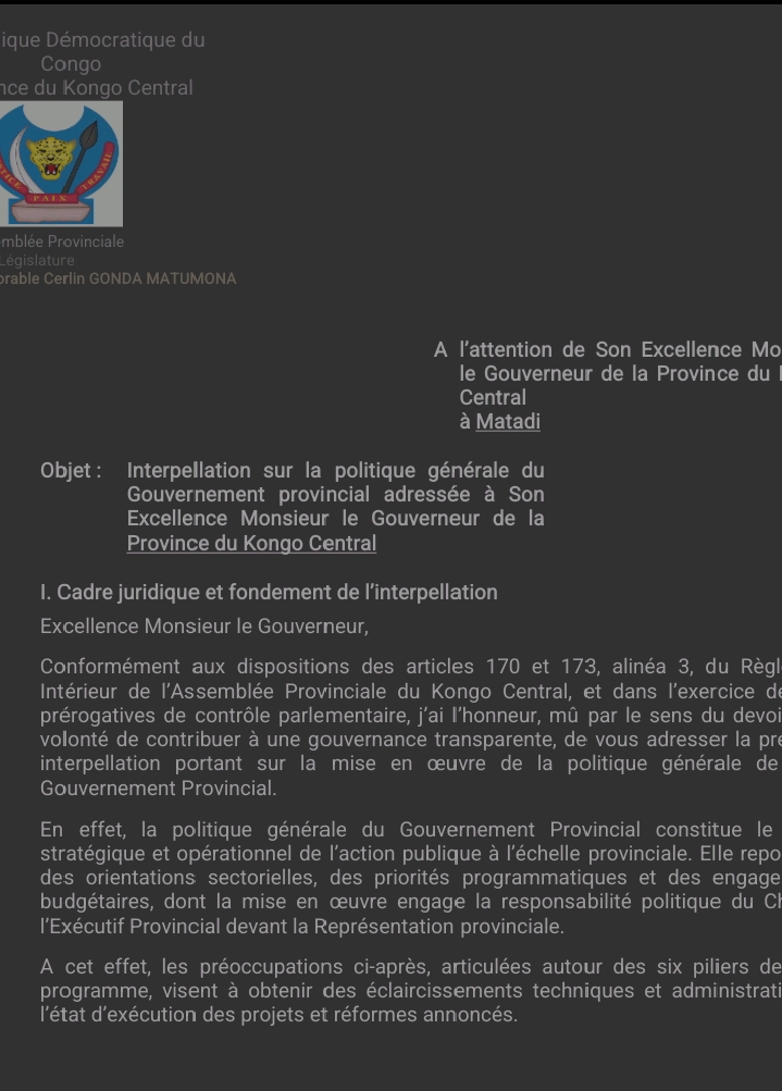 Au lendemain d’une plénière très attendue à l’Assemblée provinciale du Kongo Central, l’honorable Dr Cerlain GONDA Matumona, député provincial élu du territoire de Madimba, a rendu public ce vendredi le document officiel de son interpellation adressée au Gouverneur Grâce Bilolo, portant sur « la politique générale du Gouvernement provincial ».