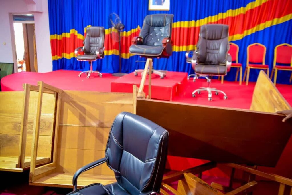 Des tables et sièges endommagés, des équipements de sonorisation détruits, ainsi qu’une caméra de l’Assemblée réduite à néant les dégâts matériels témoignent de la gravité des affrontements.