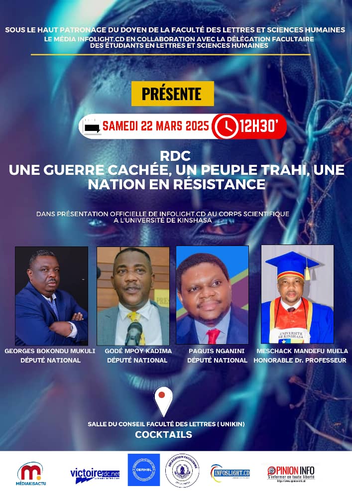 L’Université de Kinshasa sera le théâtre d’un événement inédit qui marquera à la fois le paysage académique et médiatique congolais Ce samedi 22 mars 2025. Sous le thème « Vérités étouffées, Peuple trahi, Nation en sursaut », une double cérémonie mêlant conférence-débat et lancement officiel du média Infolight.cd se tiendra sous le haut patronage du Doyen de la Faculté des Lettres et Sciences Humaines, le Professeur Eugène Bitende Ntotila.