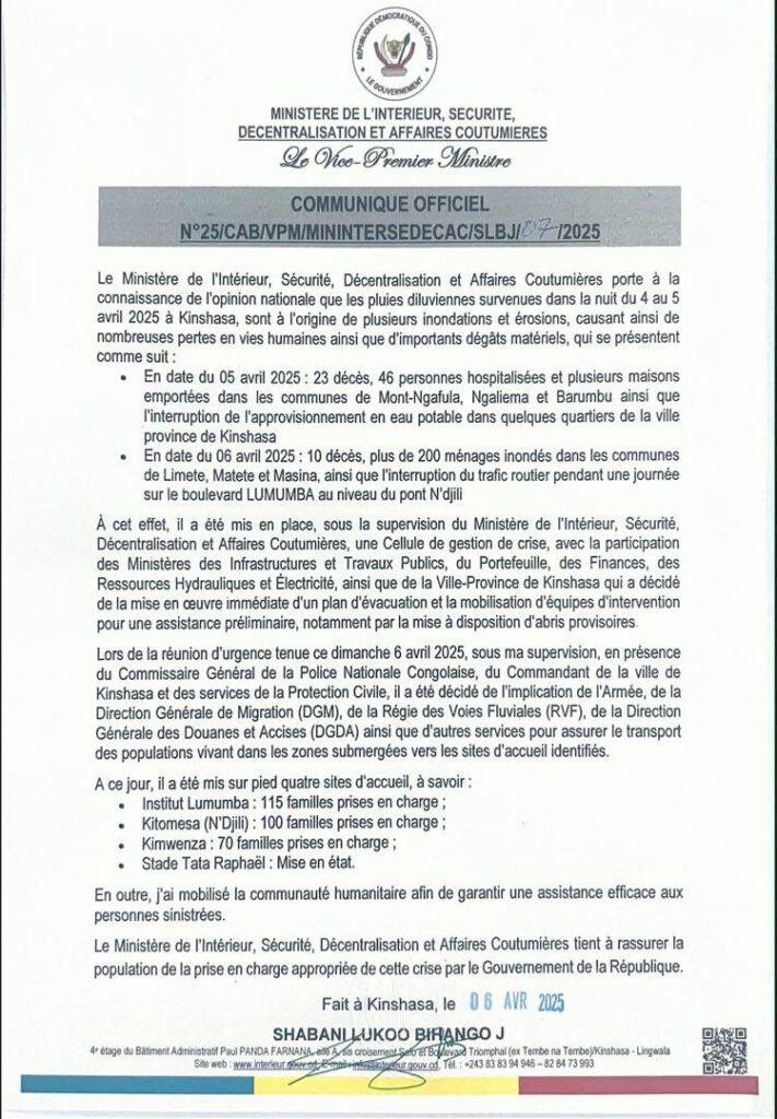 Dans un communiqué officiel consulté par notre rédaction ce dimanche tard dans la soirée, le ministre de l’Intérieur, de la Sécurité, de la Décentralisation et des Affaires coutumières est revenu sur les récentes inondations meurtrières qui ont frappé la ville de Kinshasa dans la nuit du 4 au 5 avril 2025. Il a tenu à apporter des clarifications importantes sur l’origine de cette catastrophe, son bilan, ainsi que les mesures concrètes prises pour venir en aide aux victimes.