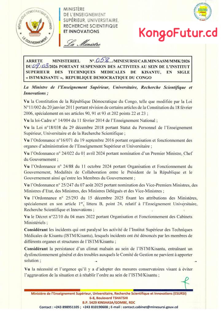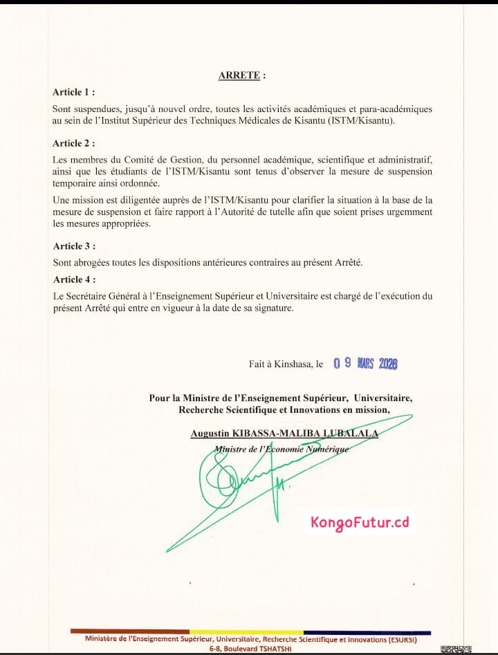 Ainsi, l’article premier de cet arrêté ordonne la suspension, jusqu’à nouvel ordre, de toutes les activités académiques et para-académiques au sein de l’ISTM Kisantu. Les membres du comité de gestion, le personnel académique, scientifique et administratif, ainsi que les étudiants sont tenus de respecter strictement cette décision.