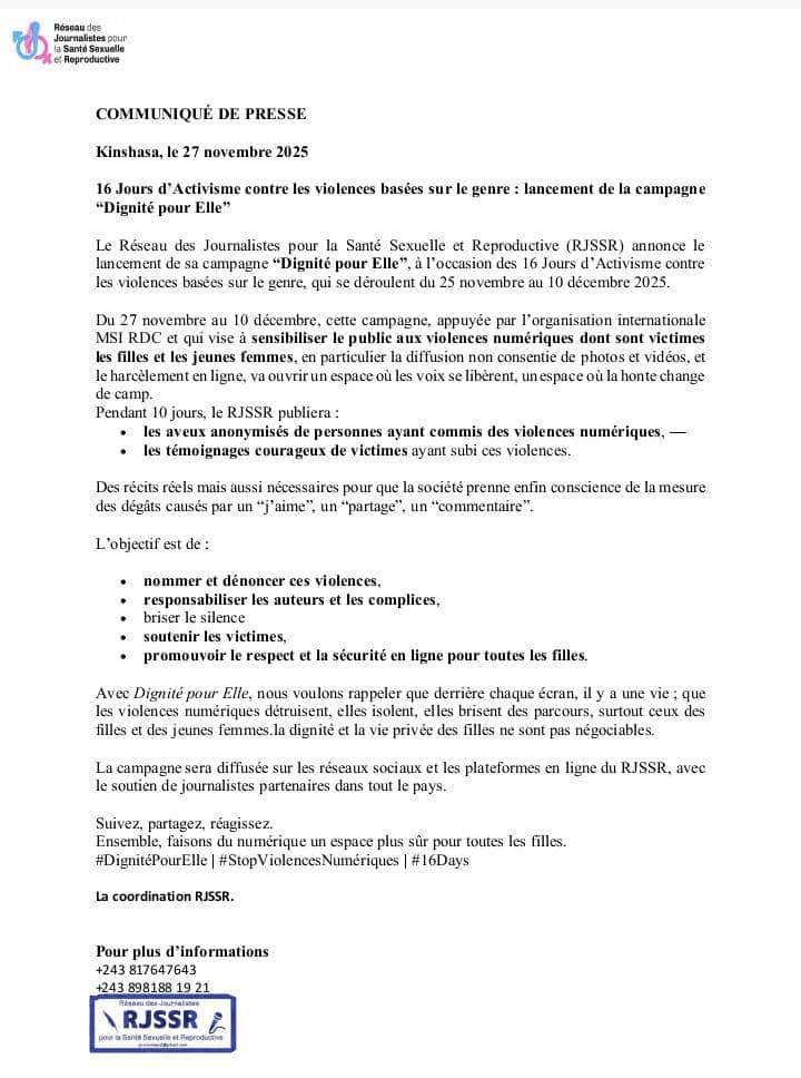 À l’occasion des 16 Jours d’Activisme contre les violences basées sur le genre, le Réseau des Journalistes pour la Santé Sexuelle et Reproductive (RJSSR) a annoncé, dans un communiqué signé le 27 novembre par sa Coordinatrice Bibiche Mbete, le lancement officiel de la campagne « Dignité pour Elle ».