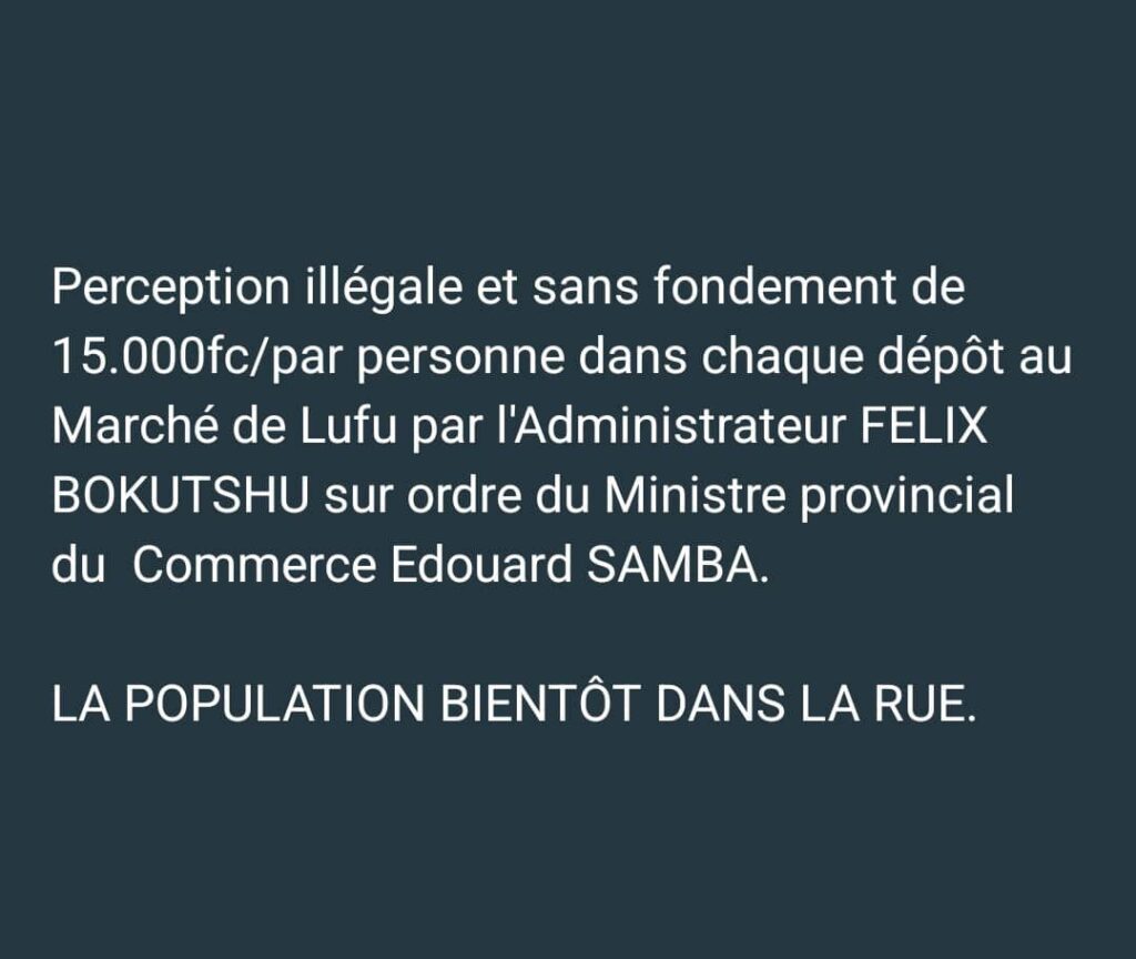 L’administrateur du marché de Lufu appelle la population à ne pas prêter foi à ces rumeurs qu’il qualifie de malveillantes. Il réaffirme que les seules perceptions autorisées au sein du marché sont celles des taxes légales prévues par l’État congolais, notamment les taxes foncières et administratives régulières.