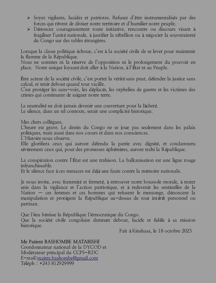 Il exhorte enfin la société civile congolaise à retrouver sa boussole morale et à demeurer fidèle à sa mission historique : défendre la paix, la justice, la souveraineté et la dignité du peuple congolais.