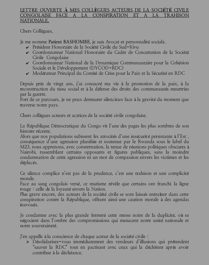 Une lettre ouverte signée le 18 octobre 2025 par Maître Patient BASHOMBE, avocat, personnalité sociale de renom et ancien président de la Société Civile du Sud-Kivu, suscite une large réaction au sein des milieux citoyens et associatifs. Le document, adressé à ses collègues acteurs de la société civile congolaise, dénonce une conspiration nationale en cours et appelle à une mobilisation massive pour défendre la souveraineté de la République Démocratique du Congo.
