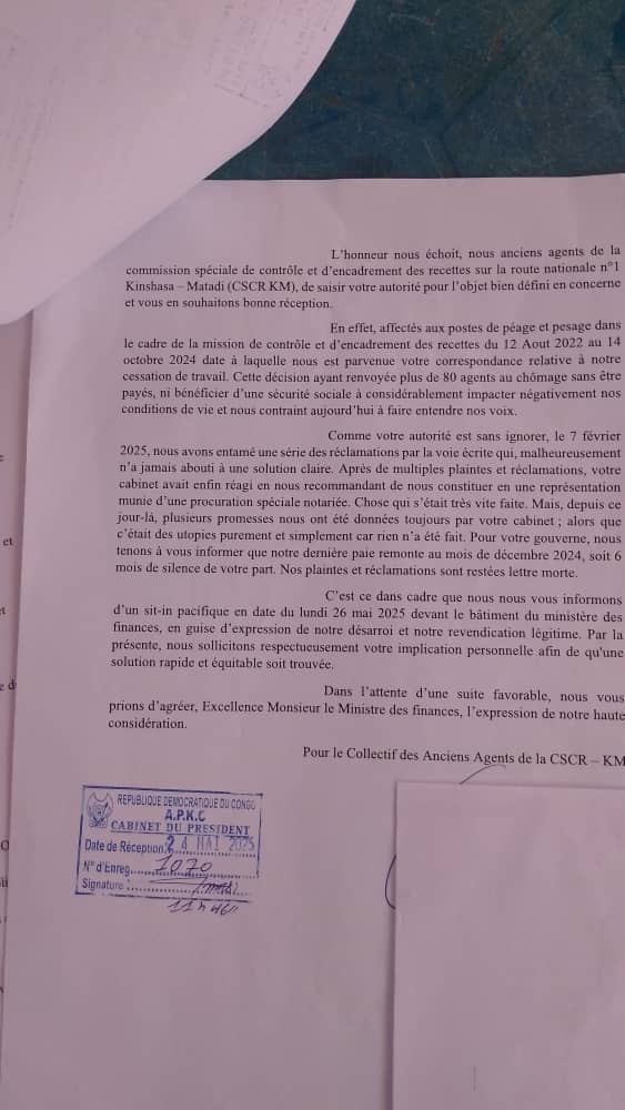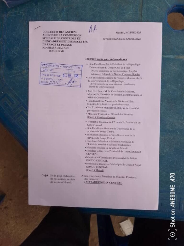 Le Collectif des anciens agents de la Commission Spéciale de Contrôle et d’Encadrement des Recettes de Péage sur la route nationale n°1 (CSCR-KM) annonce un sit-in pacifique prévu pour le lundi 26 mai 2025 devant le bâtiment du ministère provincial des Finances à Matadi.
