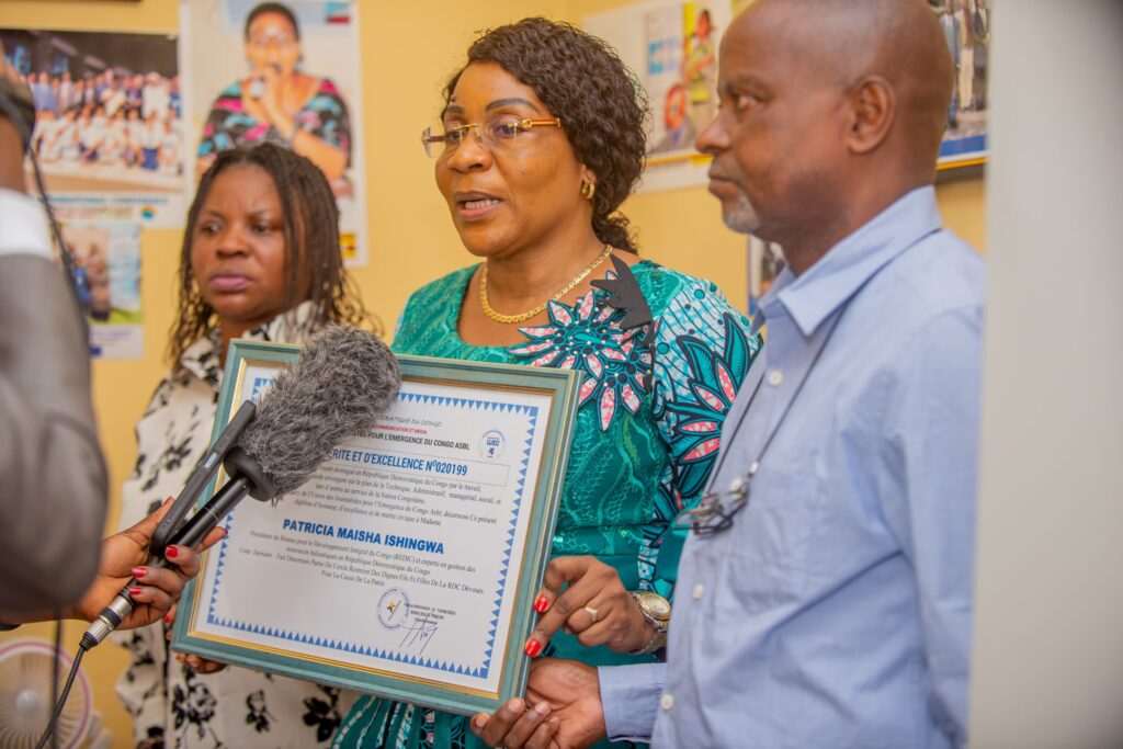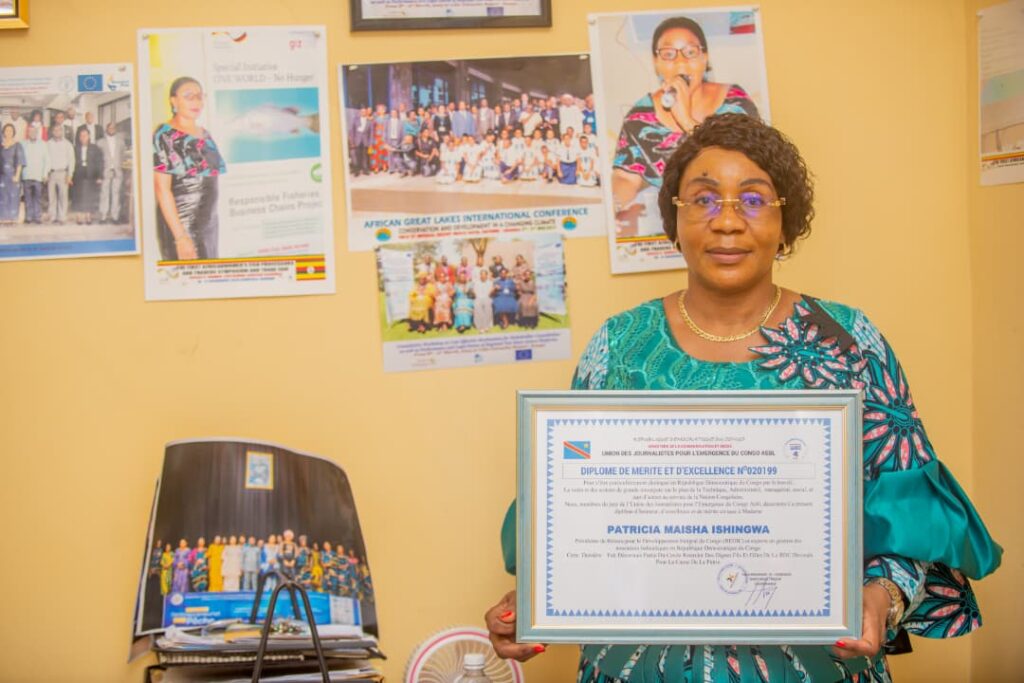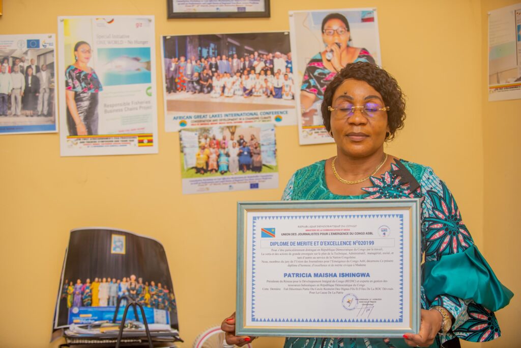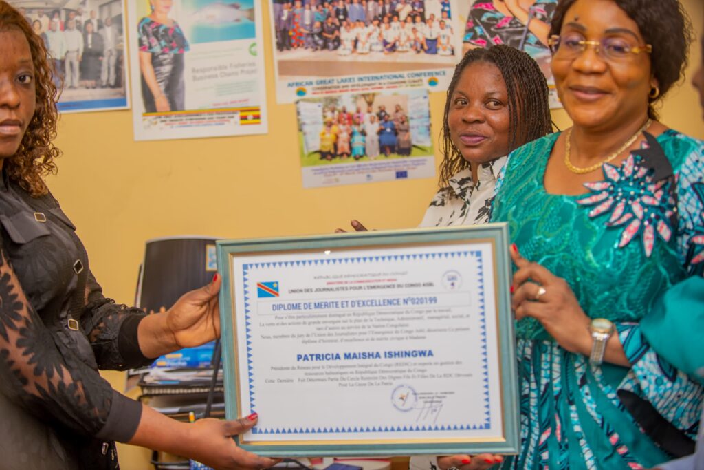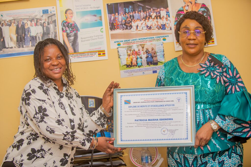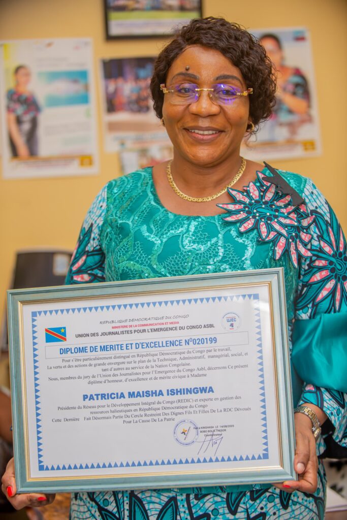 C’est dans une ambiance empreinte de joie et de reconnaissance que Madame Patricia Maisha, Présidente de REDIC-AWFISHNET-RDC, a été récompensée par un diplôme de mérite et un prix patriotique, en hommage à son engagement remarquable dans le secteur de la pêche et de l’aquaculture en République Démocratique du Congo.