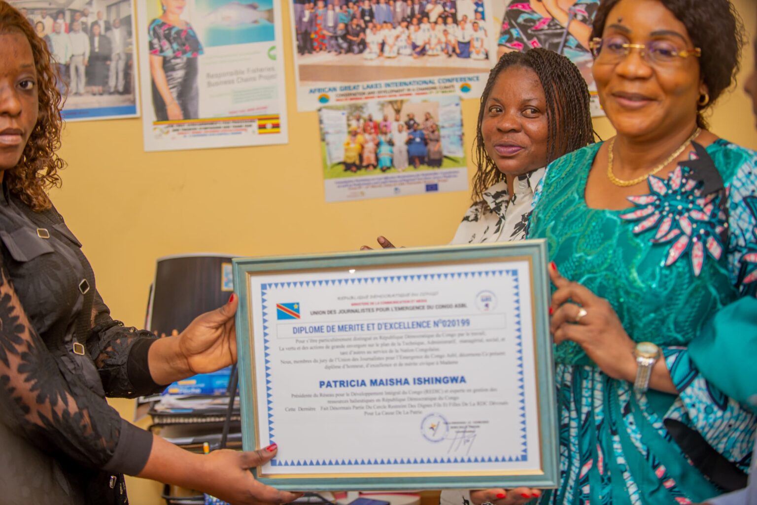 C’est dans une ambiance empreinte de joie et de reconnaissance que Madame Patricia Maisha, Présidente de REDIC-AWFISHNET-RDC, a été récompensée par un diplôme de mérite et un prix patriotique, en hommage à son engagement remarquable dans le secteur de la pêche et de l’aquaculture en République Démocratique du Congo.