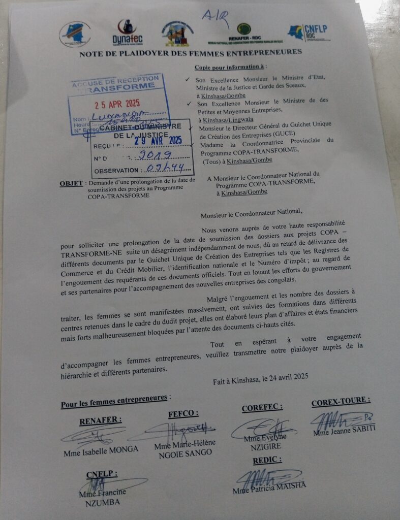 Ce document, intitulé « Demande de prolongation de la date de soumission des projets au Programme COPA-TRANSFORME », soulignait les obstacles rencontrés par de nombreuses entrepreneures, notamment les délais dans l’obtention des documents administratifs (RCCM, numéro d’identification nationale, numéro d’impôt) auprès du GUCE.