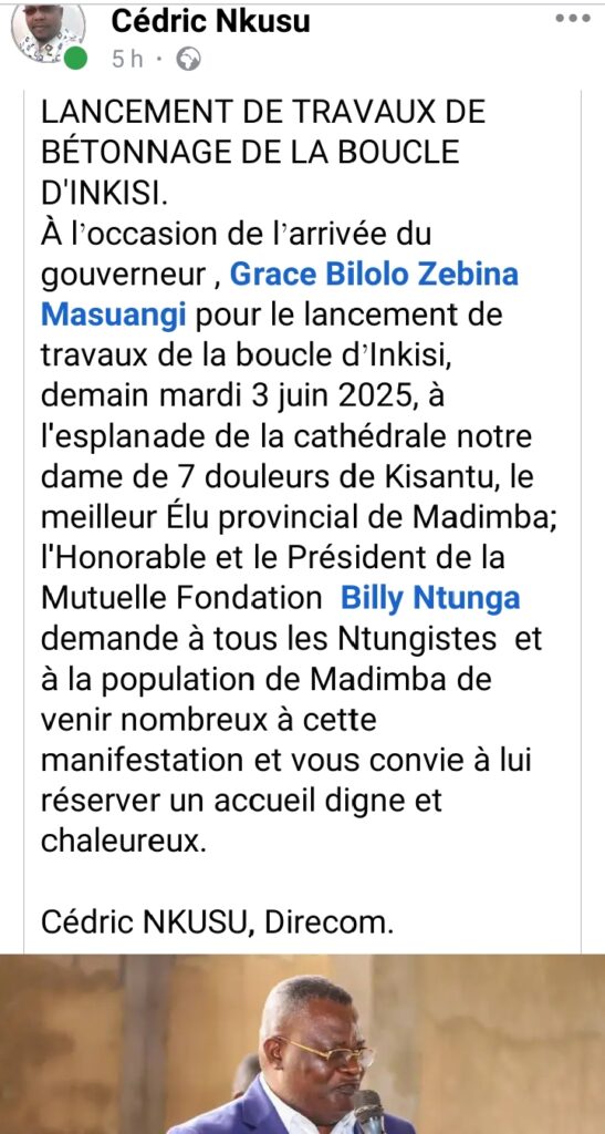 « Nous avons longtemps plaidé pour la construction de la boucle d’Inkisi. C’est un projet stratégique qui va transformer le quotidien des habitants de Kisantu et de Madimba. Nous devons venir nombreux soutenir cette initiative qui marque un pas concret vers le développement. »