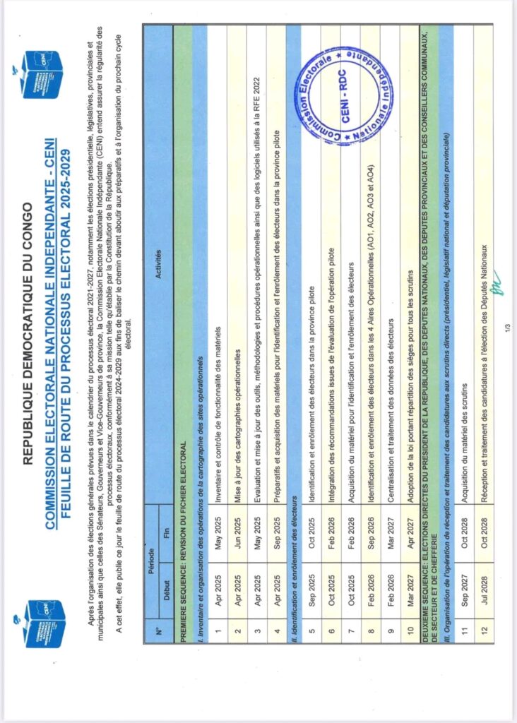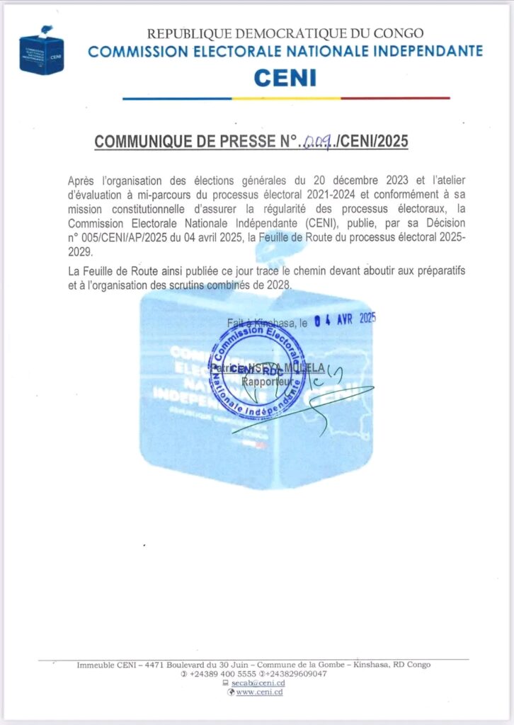 « Après l’organisation des élections générales du 20 décembre 2023 et l’atelier d’évaluation à mi-parcours du processus électoral 2021-2024, et conformément à sa mission constitutionnelle, la CENI publie, par sa Décision n° 005/CENI/AP/2025 du 04 avril 2025, la Feuille de Route du processus électoral 2025-2029 », peut-on lire dans le communiqué.