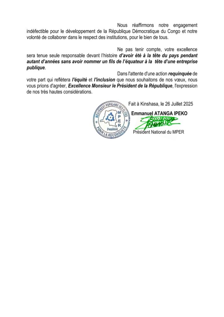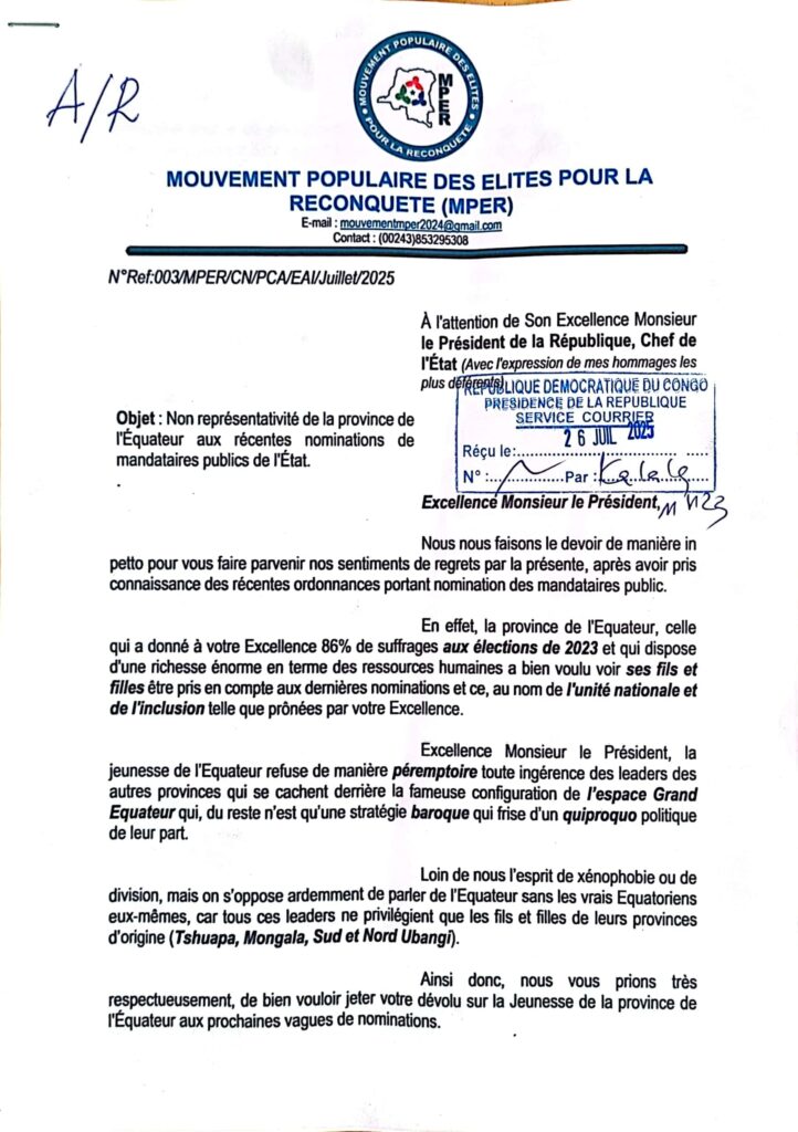 La lettre dénonce également l’influence « douteuse » de leaders venus d’autres provinces voisines (Tshuapa, Mongala, Sud et Nord-Ubangi), qui s’approprieraient indûment la voix de l’Équateur authentique. « Pas d’Équateur sans Équatoriens », martèle le MPER, qui réclame une vraie inclusion et une juste redistribution des postes.